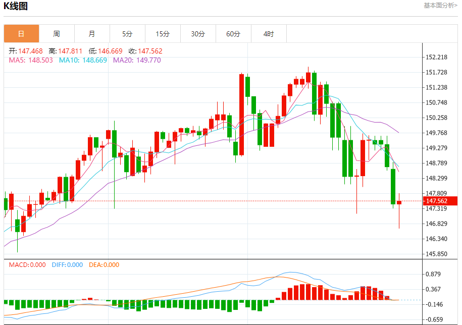 汇价高见147.811,低见146.669。上一交易日,汇价收于147.469。