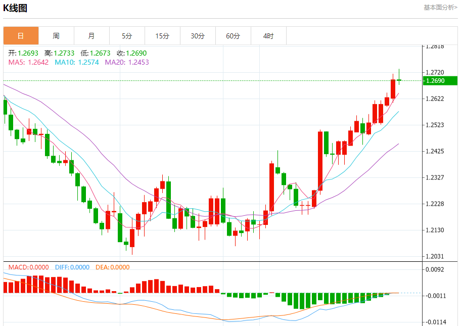 汇价高见1.2733,低见1.2673。上一交易日,汇价收于1.2693。