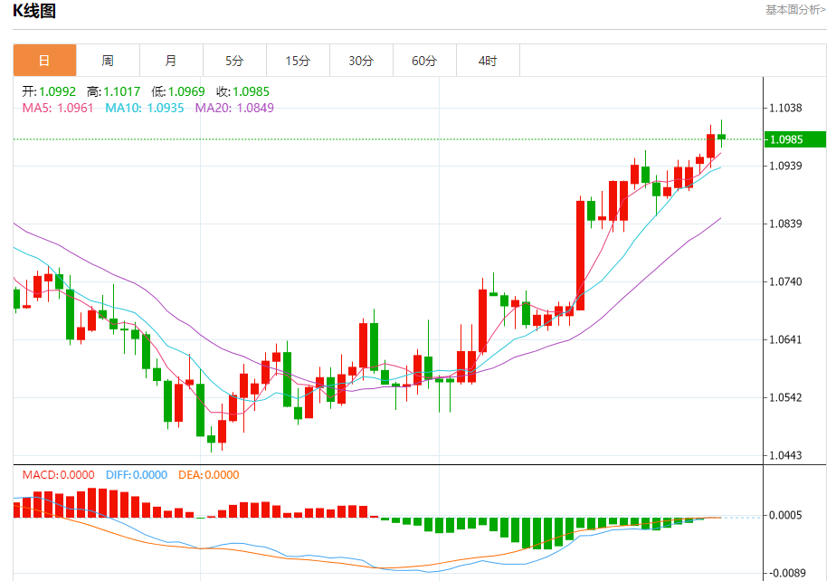 汇价高见1.1017,低见1.0969。上一交易日,汇价收于1.0992。