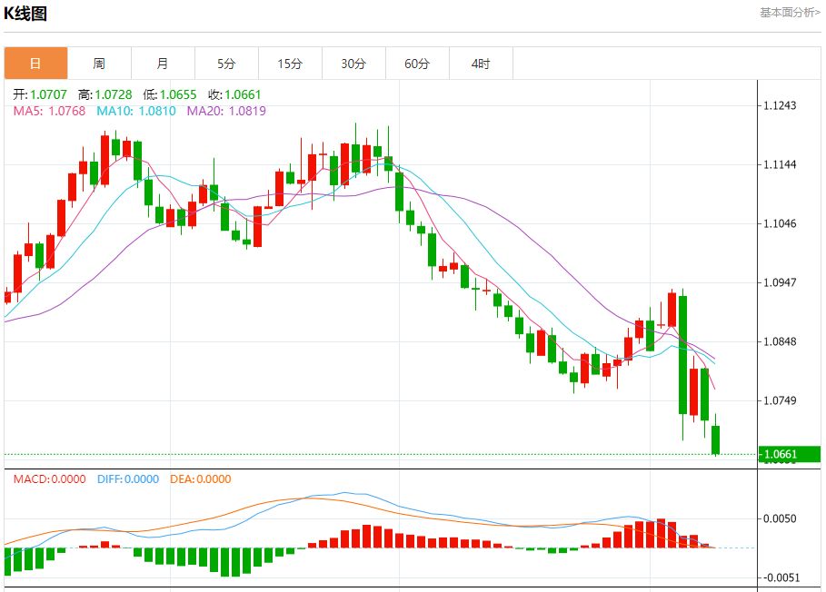汇价高见1.0728,低见1.0655。上一交易日,汇价收于1.0717。