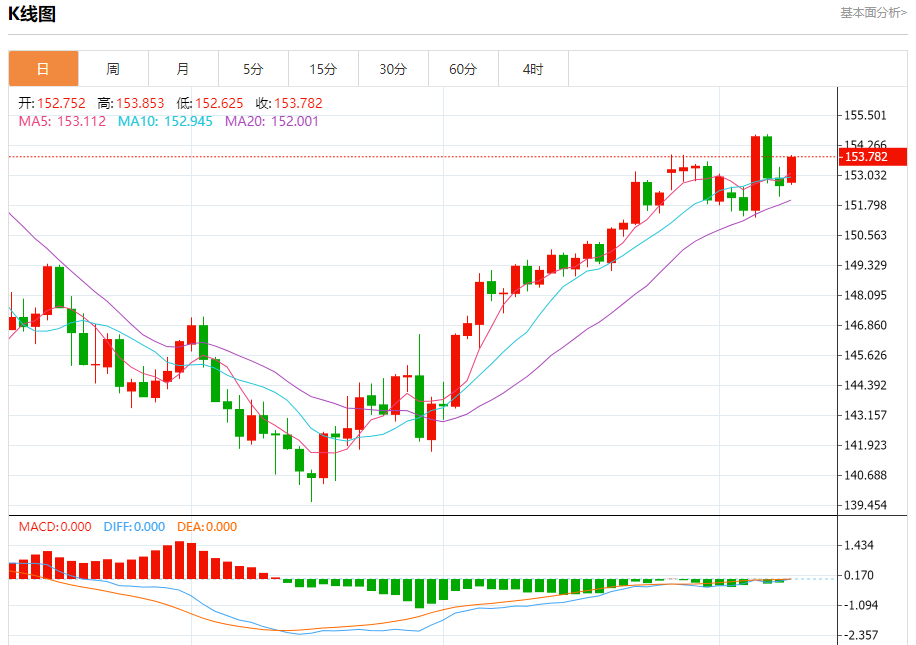 汇价高见153.853,低见152.625。上一交易日,汇价收于152.617。