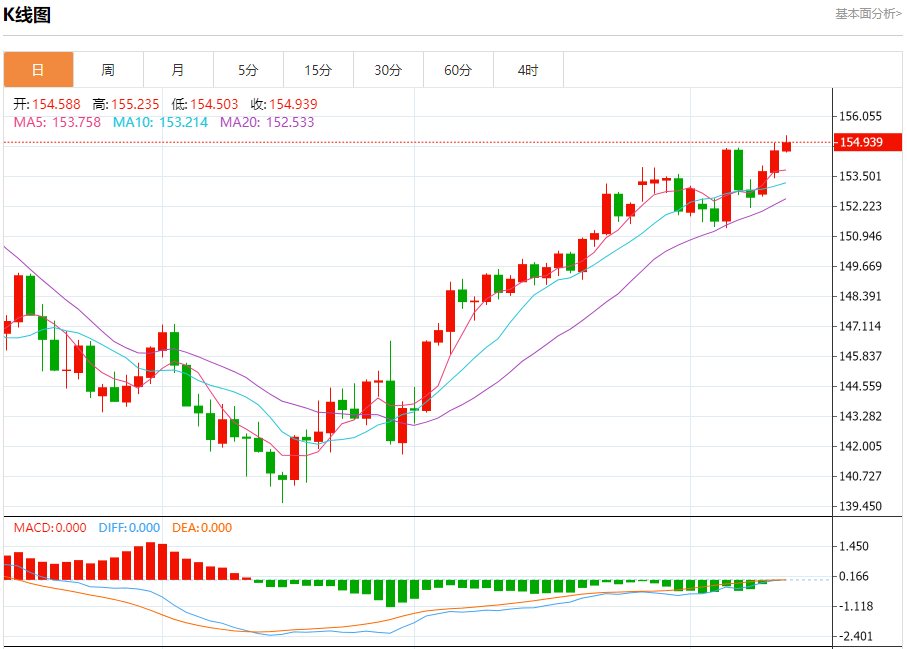 汇价高见155.235,低见154.503。上一交易日,汇价收于154.591。