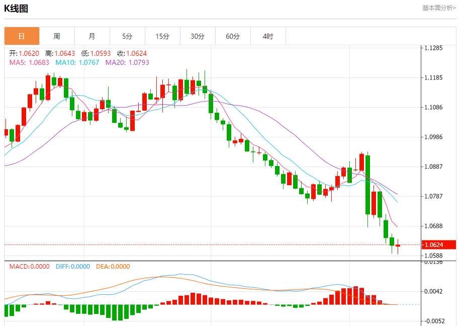 汇价高见1.0643,低见1.0593。上一交易日,汇价收于1.0623。