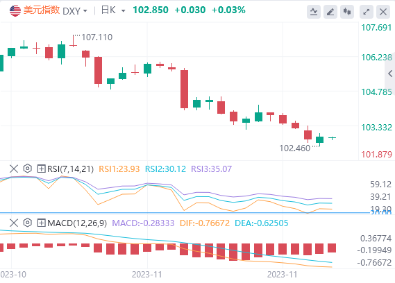 美元指数周三一度测试102.467,但在美国第三季GDP数据之后略有反弹。不过,只要维持在103下方,那么美元指数仍有下跌至102-101.50的空间。