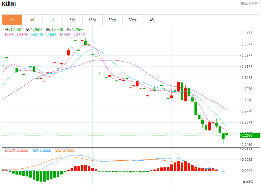 汇价高见1.2607,低见1.2548。上一交易日,汇价收于1.2530。