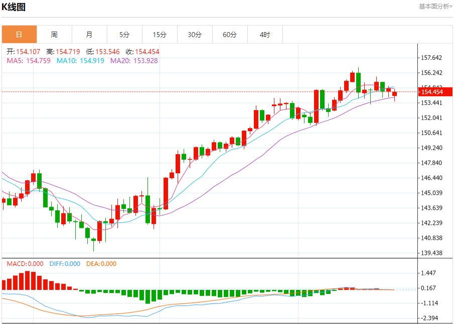 汇价高见154.719,低见153.546。上一交易日,汇价收于154.776。