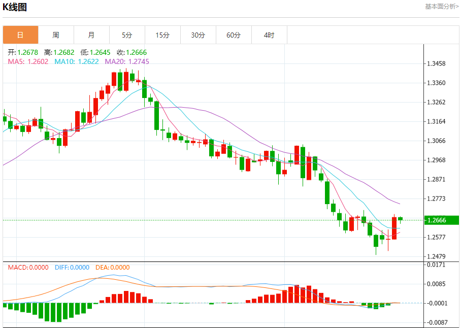 汇价高见1.2682,低见1.2645。上一交易日,汇价收于1.2678。