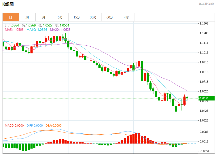 汇价高见1.0569,低见1.0527。上一交易日,汇价收于1.0566。