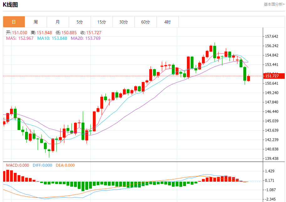 汇价高见151.945,低见150.885。上一交易日,汇价收于151.079。