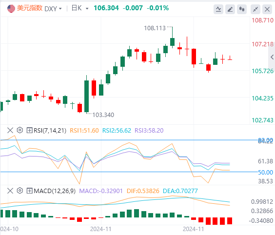 美元指数曾小幅下跌至106.087,但随后迅速回升。只要守住支撑位105.50,我们仍然认为,未来几个交易时段美元指数将涨向107-108。