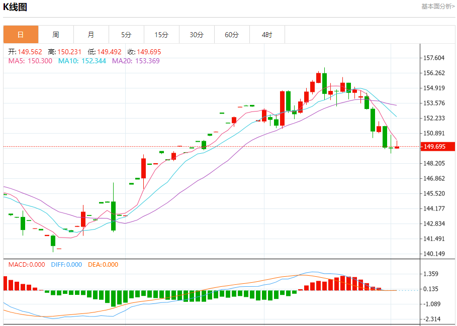 汇价高见150.231,低见149.492。上一交易日,汇价收于149.578。