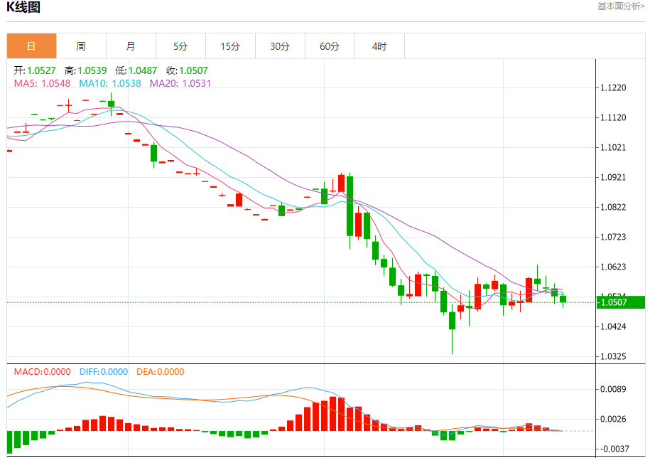 汇价高见1.0539,低见1.0487。上一交易日,汇价收于1.0527。