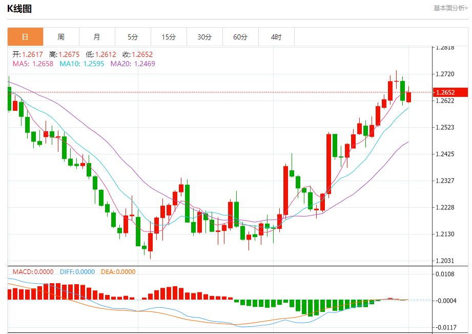 汇价高见1.2675,低见1.2613。上一交易日,汇价收于1.2623。