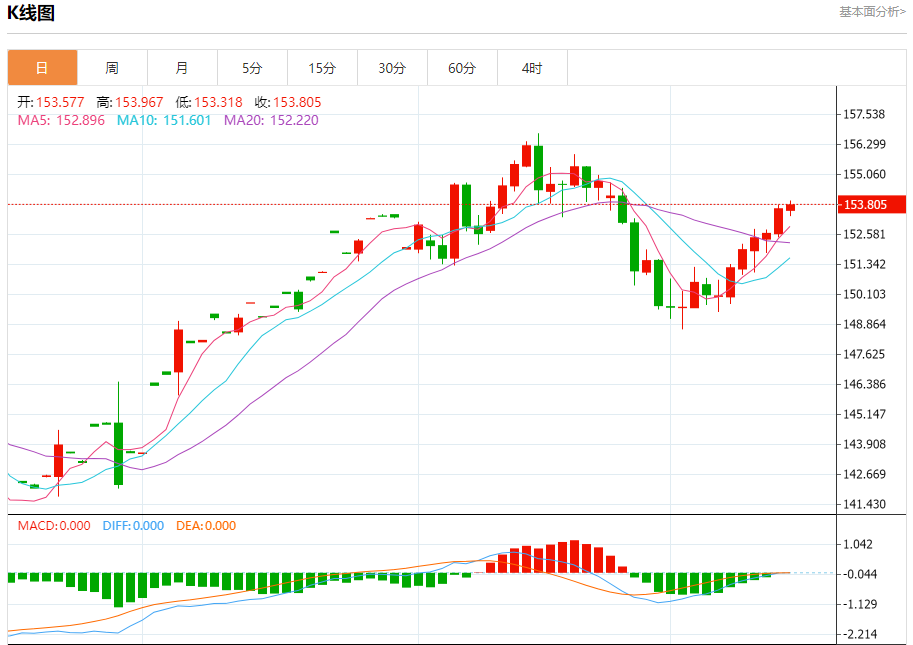 汇价高见153.967,低见153.316。上一交易日,汇价收于153.653。
