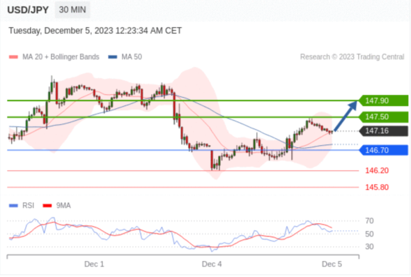 在 146.70 之上,看涨,目标价位为 147.50 ,然后为 147.90 。