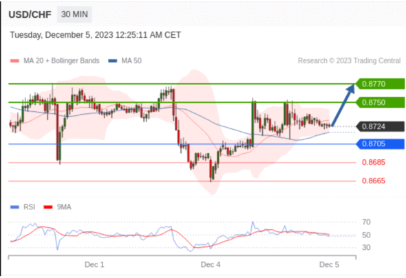在 0.8705 之上,看涨,目标价位为 0.8750 ,然后为 0.8770 。