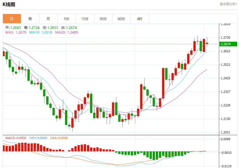 汇价高见1.2724,低见1.2653。上一交易日,汇价收于1.2709。