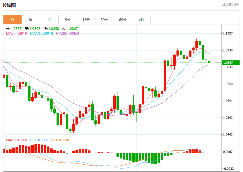 汇价高见1.0895,低见1.0850。上一交易日,汇价收于1.0880。