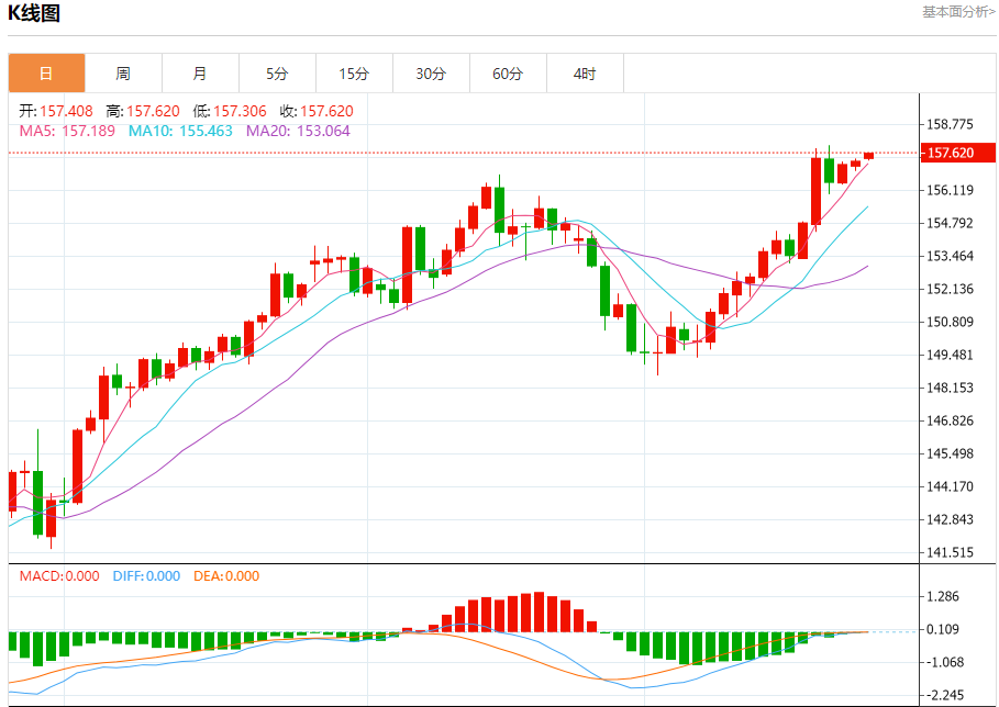 汇价高见157.613,低见157.306。上一交易日,汇价收于157.298。