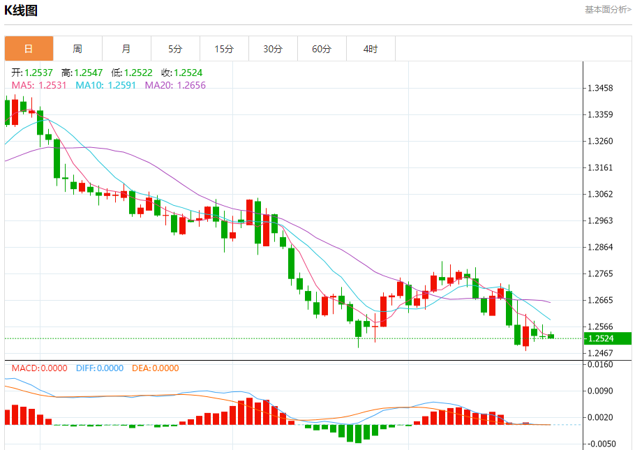 汇价高见1.2547,低见1.2521。上一交易日,汇价收于1.2530。