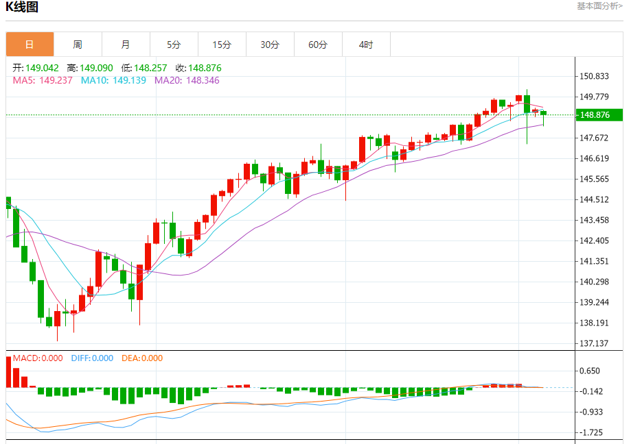 汇价高见149.090,低见148.257。上一交易日,汇价收于149.122。