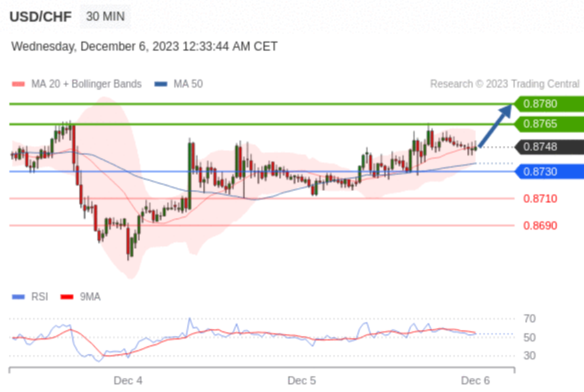 在 0.8730 之上,看涨,目标价位为 0.8765 ,然后为 0.8780 。