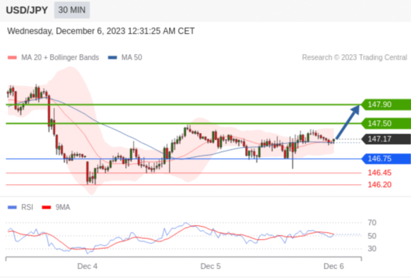 在 146.75 之上,看涨,目标价位为 147.50 ,然后为 147.90 。