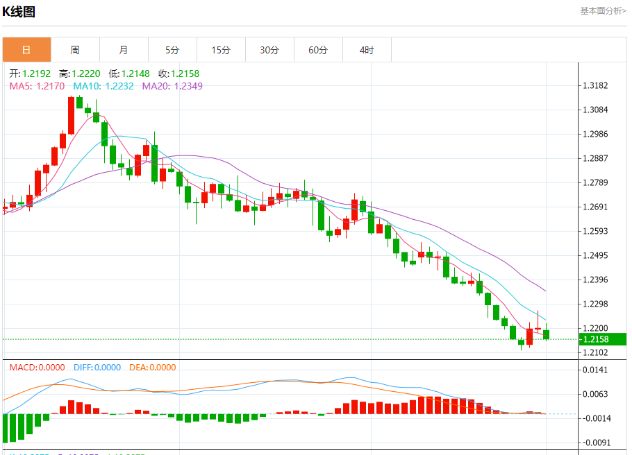 汇价高见1.2220,低见1.2148。上一交易日,汇价收于1.2201。