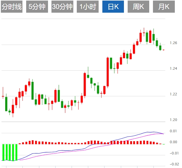 日图自1.2730高点附近回落并跌破近期高位整理区间支持1.2600,随机指标仍倾向走低,关注能否重返MA20上方。4小时图震荡下行,当前测试MA100,若能收复该线将有望重启涨势。小时图再创新低,多头动能有限。