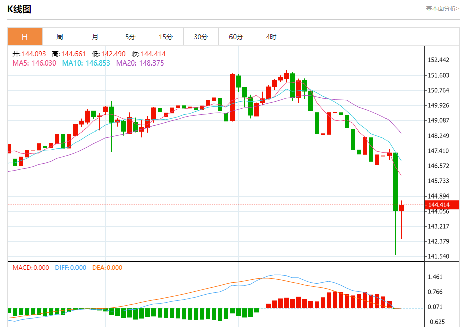 汇价高见144.661,低见142.490。上一交易日,汇价收于144.089。