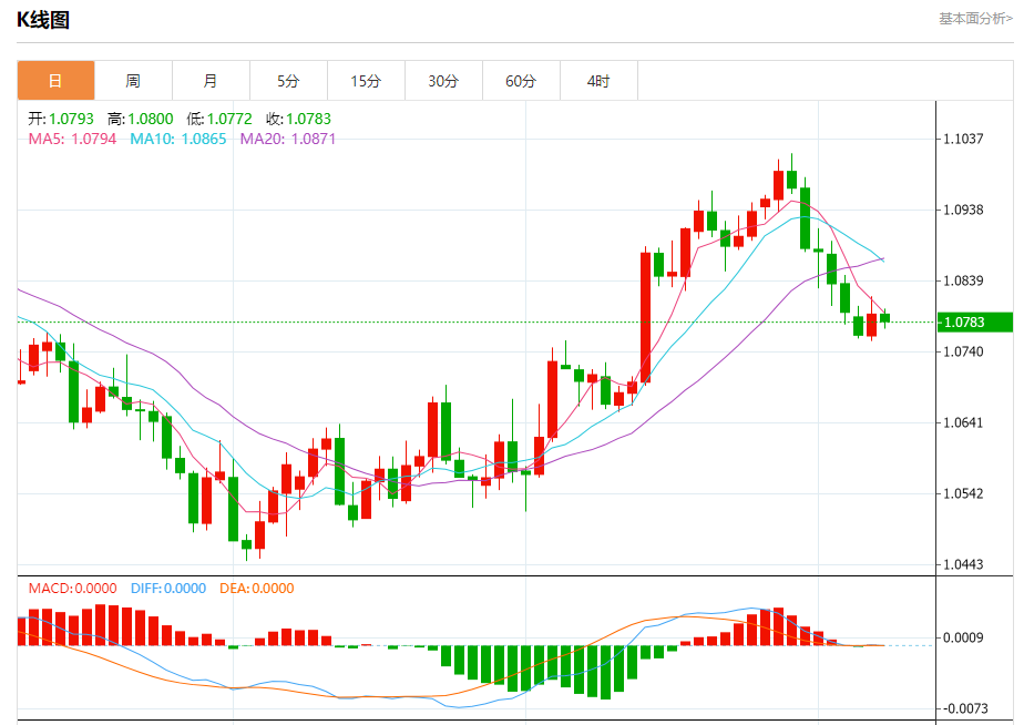 汇价高见1.0800,低见1.772。上一交易日,汇价收于1.0793。