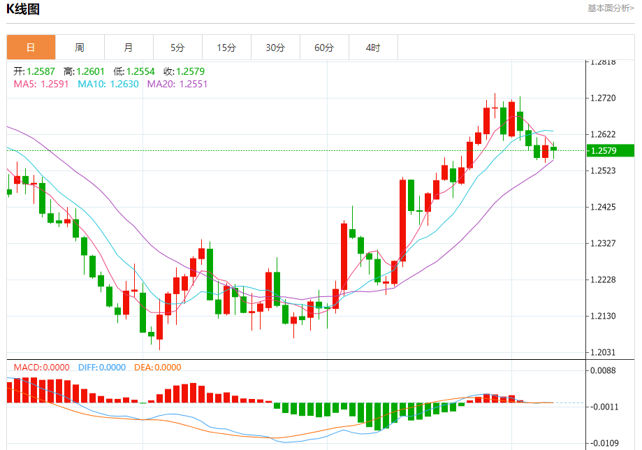 汇价高见1.2601,低见1.2554。上一交易日,汇价收于1.2592。