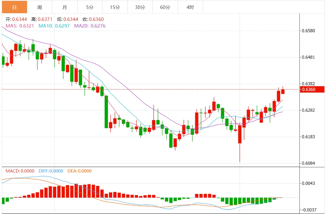 澳元/美元技术分析:接近上升通道的上边界附近0.6400