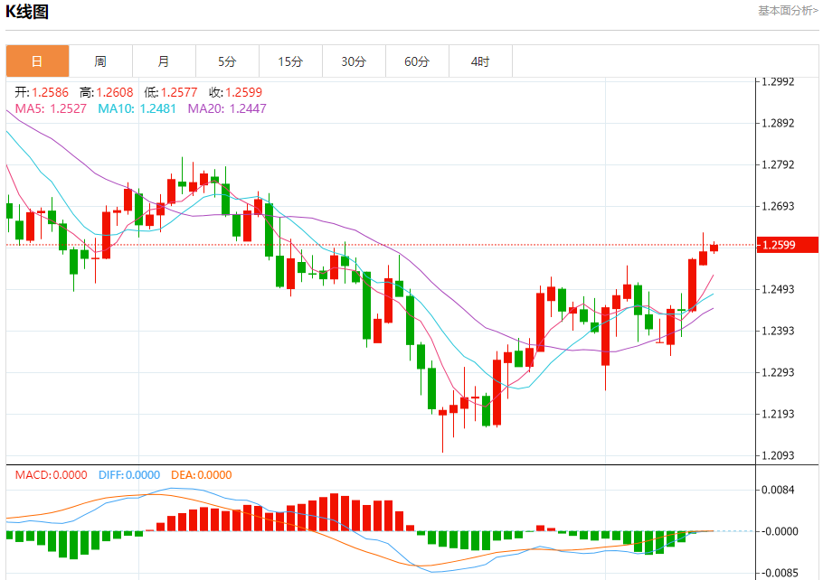 汇价高见1.2608,低见1.2578。上一交易日,汇价收于1.2583。