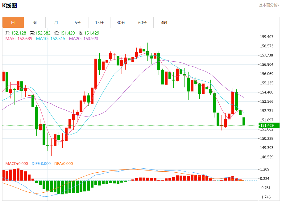 汇价高见152.382,低见151.444。上一交易日,汇价收于152.350。