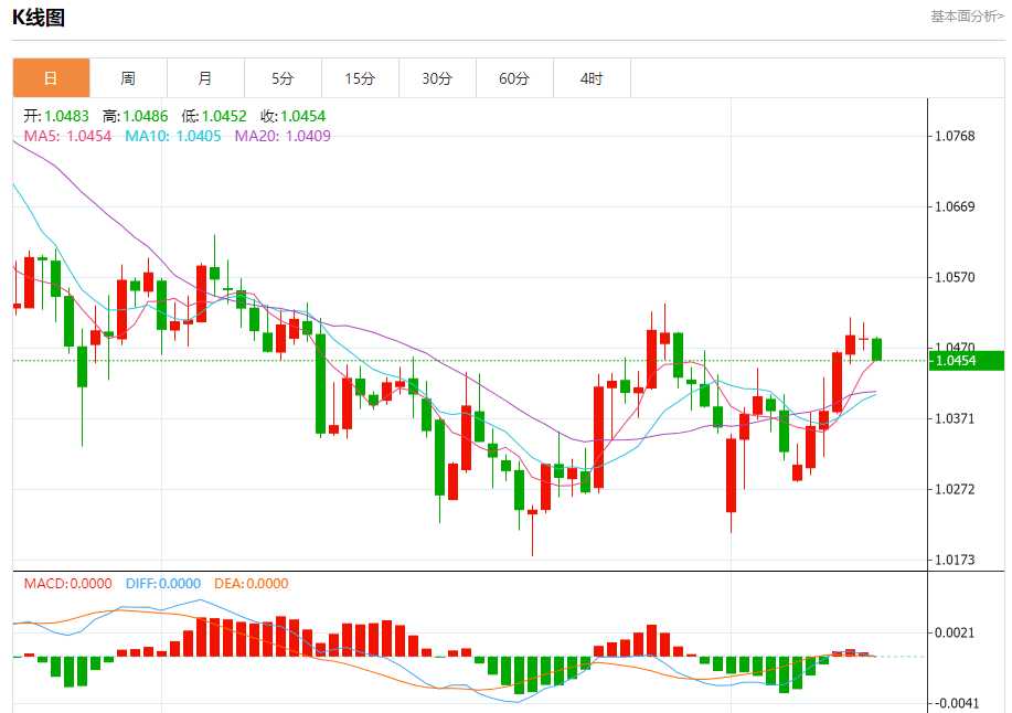 汇价高见1.0486,低见1.0452。上一交易日,汇价收于1.0483。