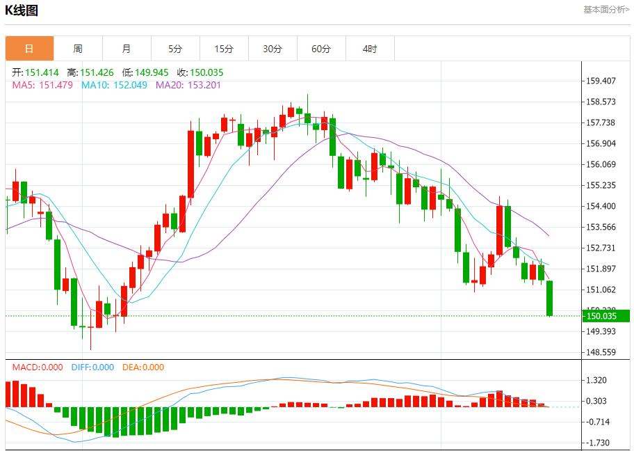 汇价高见151.426,低见149.945。上一交易日,汇价收于151.458。