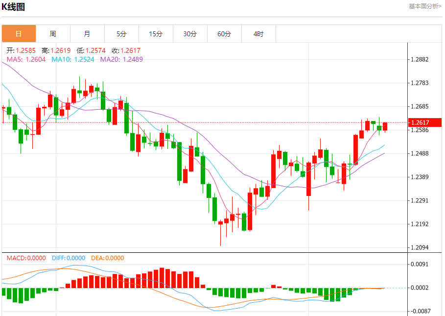 汇价高见1.2619,低见1.2574。上一交易日,汇价收于1.2586。
