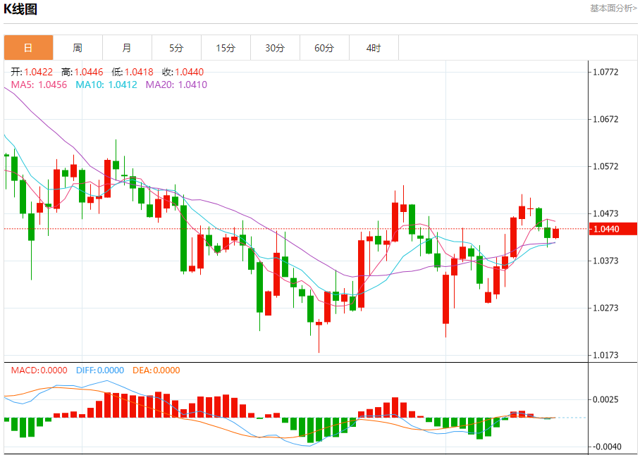 汇价高见1.0446,低见1.0418。上一交易日,汇价收于1.0422。