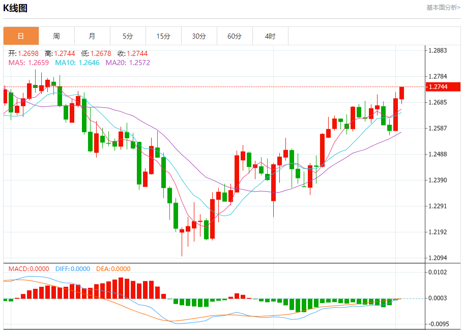 汇价高见1.2743,低见1.2678。上一交易日,汇价收于1.2700。