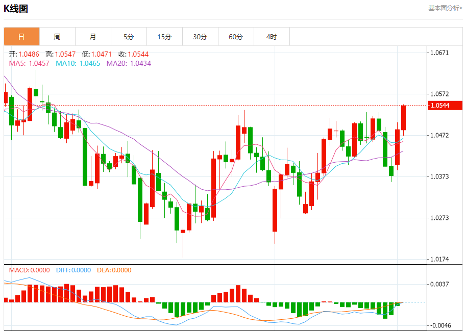 汇价高见1.0546,低见1.0471。上一交易日,汇价收于1.0486。