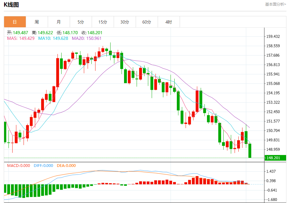 汇价高见149.622,低见148.173。上一交易日,汇价收于149.489。