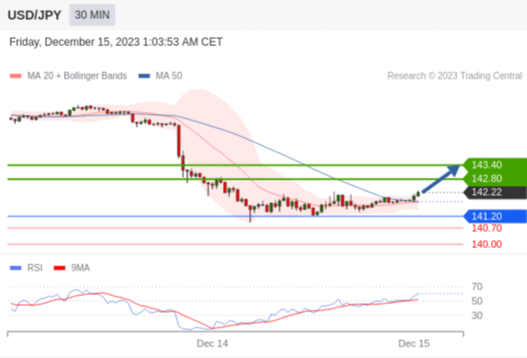 在 141.20 之上,看涨,目标价位为 142.80 ,然后为 143.40 。