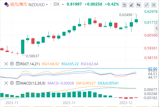 纽元/美元周四欧洲时段在0.6210附近走高,从五个月高点0.6249回落,主要阻力位在0.6250。14天相对强弱指数(RSI)位于50水平上方,表明市场看涨后市。