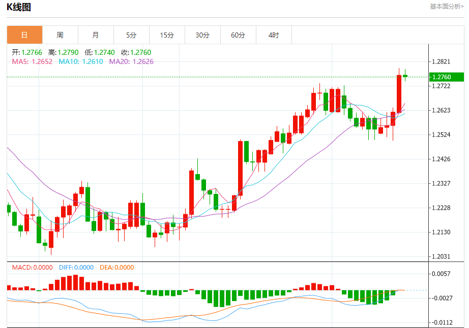 汇价高见1.2790,低见1.2740。上一交易日,汇价收于1.2766。