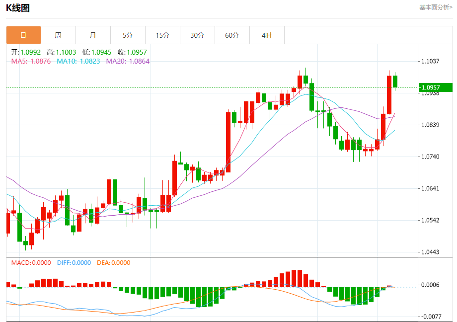 汇价高见1.1003,低见1.0945。上一交易日,汇价收于1.0992。