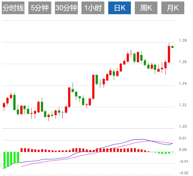 日图以大阳线突破前高1.2732,打开进一步上行空间,但短线偏离均线,不排除修正的可能性。4小时图短期均线上行提供支持,短线关注1.2800阻力。小时图连续拉升后在高位整理,随机指标熊背离。