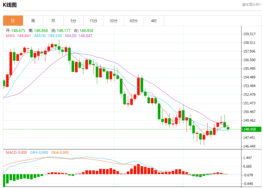 汇价高见148.868,低见148.177。上一交易日,汇价收于148.679。