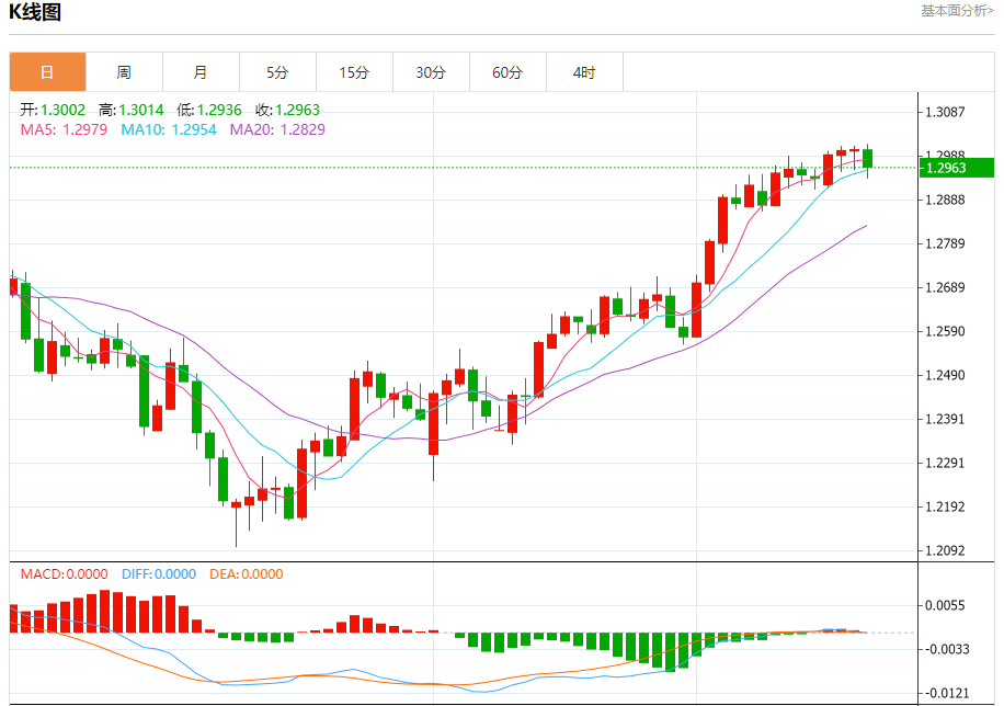 汇价高见1.3014,低见1.2936。上一交易日,汇价收于1.3002。