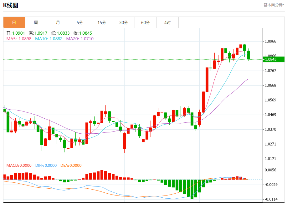汇价高见1.0917,低见1.0833。上一交易日,汇价收于1.0901。